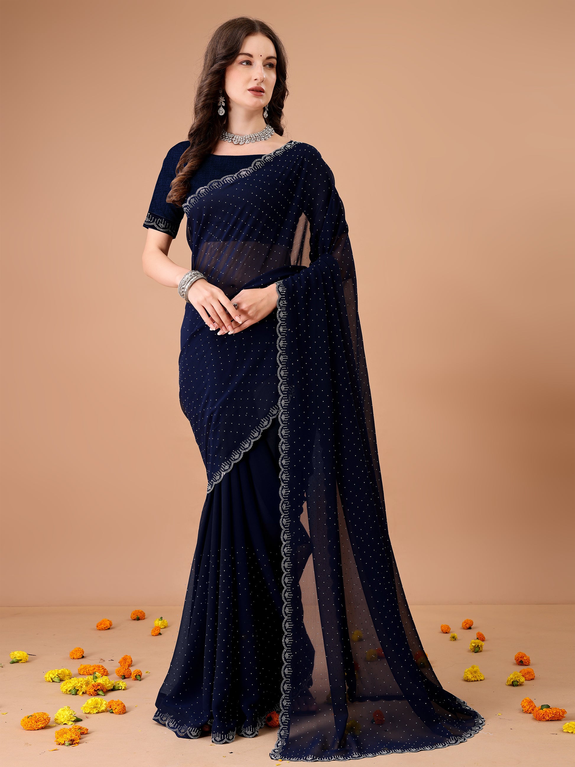Leelavati Embroidered, Embellished Bollywood Georgette Saree (Dark Blue)