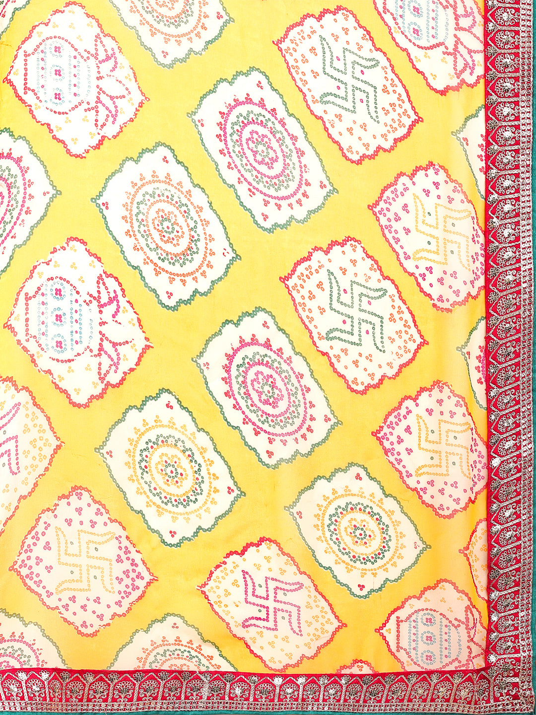 Leelavati Striped, Embroidered Bandhani Georgette Saree (Yellow, Pink)